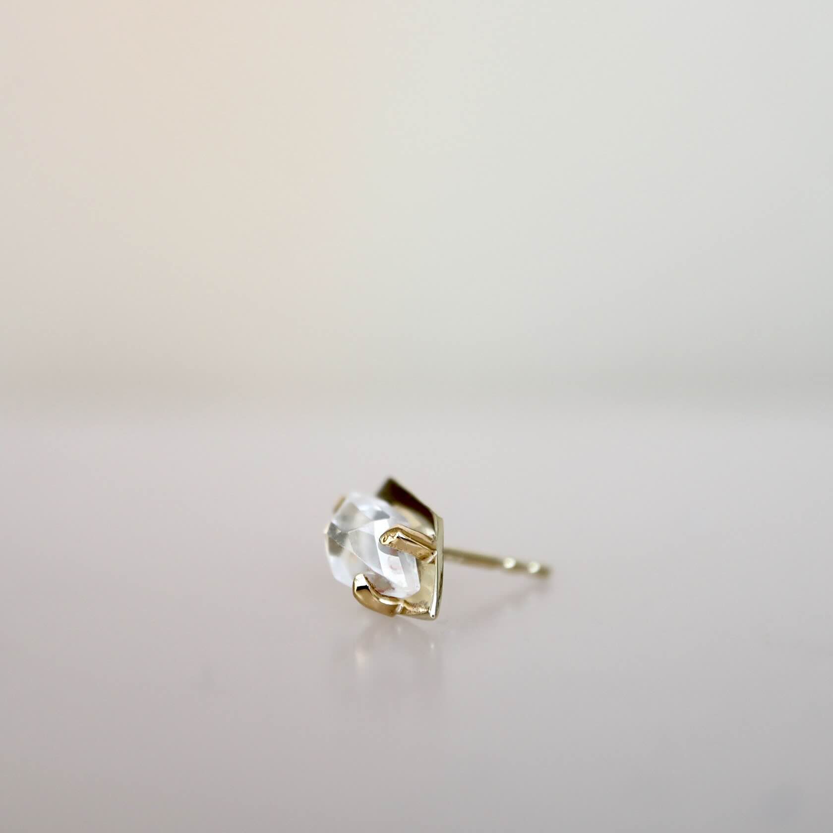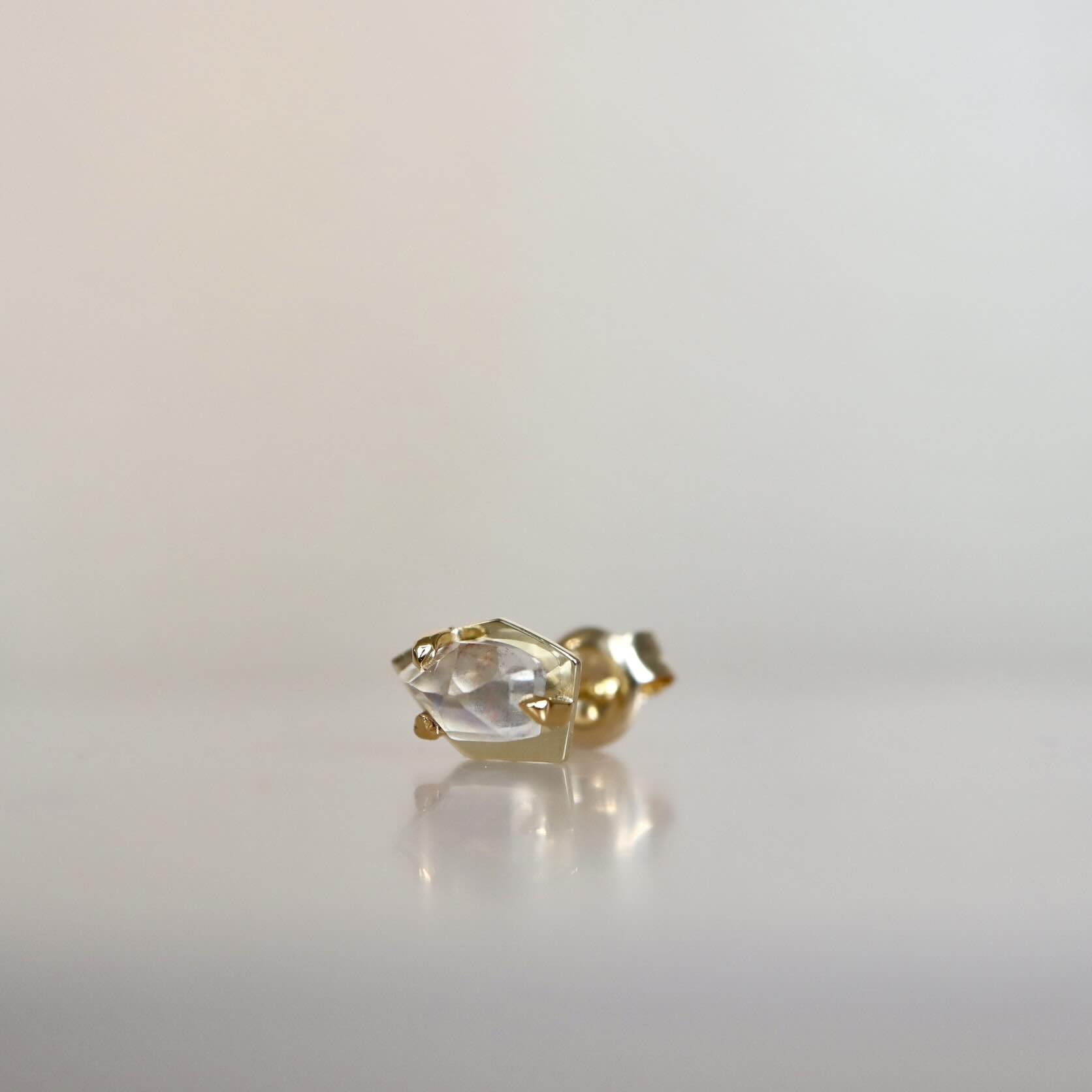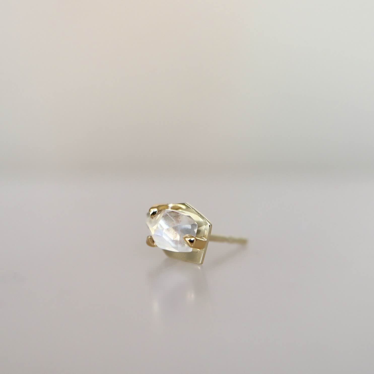 Een enkele oorbel met een rock van een maansteen. Vastgehouden op een gouden plateau met drie pootjes. De oorbel is gemaakt van 22 en 14 karaat goud.