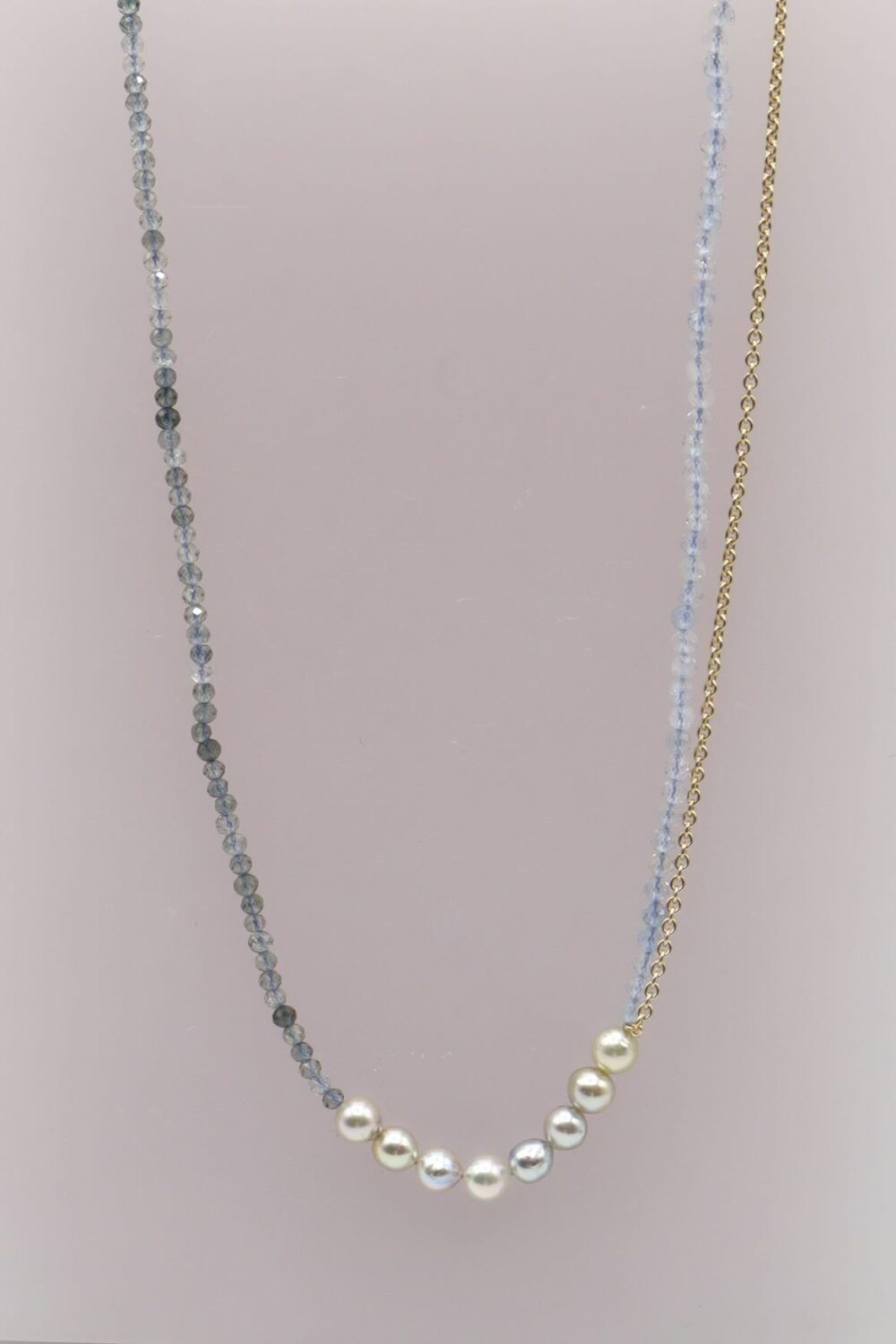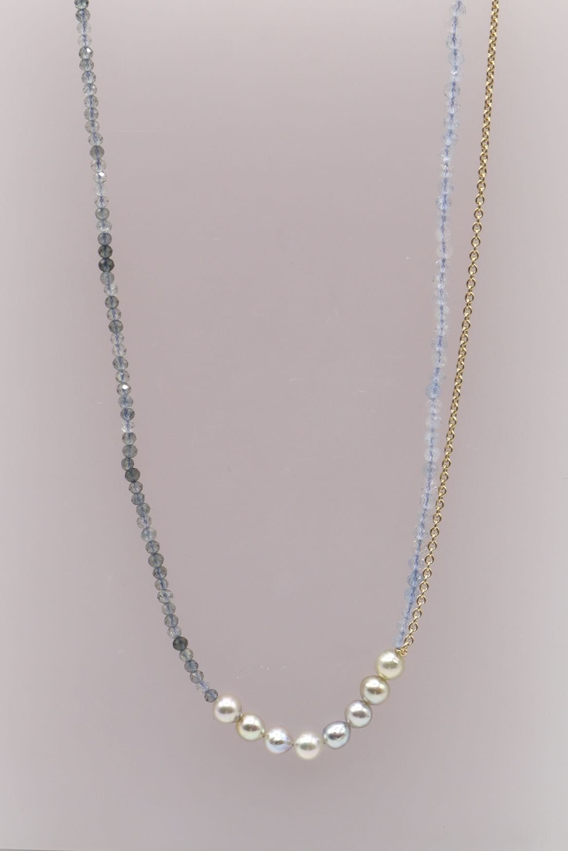 Prachtige, zachte tinten blauw en blauwgrijs met frisse sprankelingen. De glanzende akoya parels zijn het stralende middelpunt. Met een handgemaakt kapitel slot van 18 karaat goud.