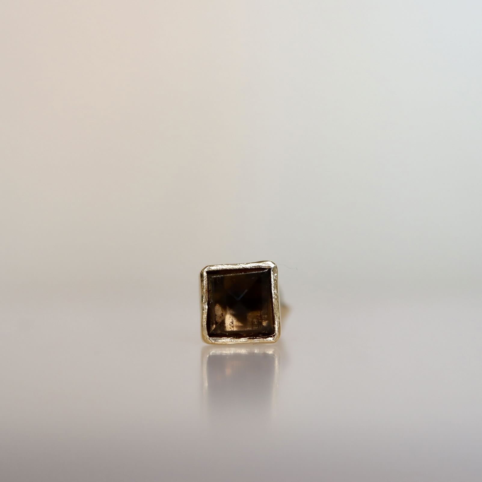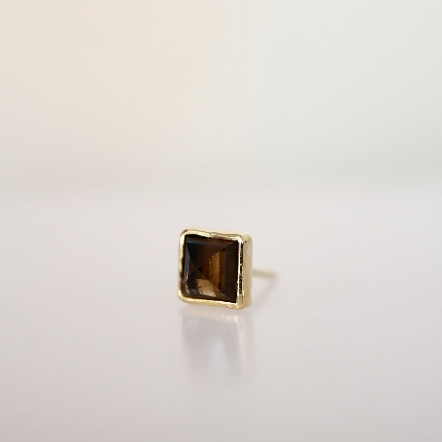 Smokey, donker fonkelend. Een enkele oorbel met een rookkwarts. De zetting is gemaakt van 22 karaat goud. De steker is gemaakt van 14 karaat goud.