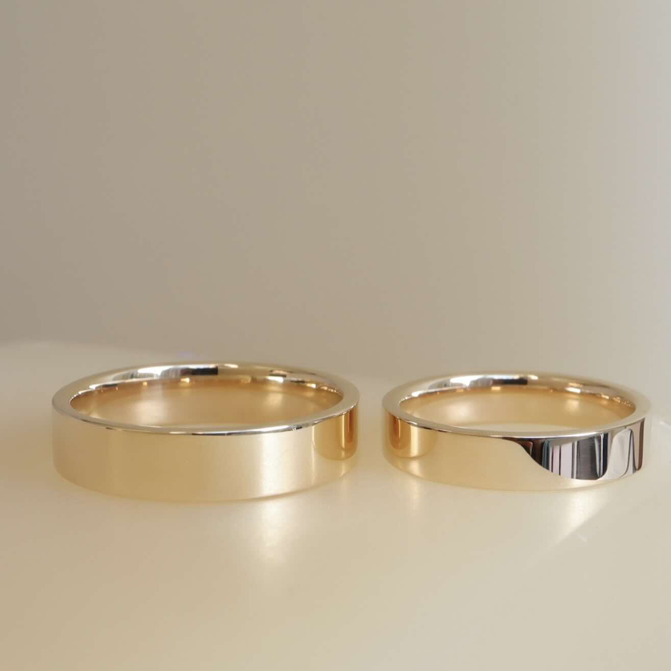 De set op de foto is gemaakt van 14k goud, en de ringen zijn in maat 16.5 en 19. Ze zijn 4 en 5mm breed.