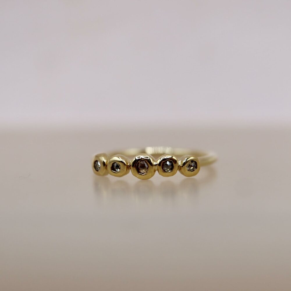 Een kroontje van vier heldere aquamarijnen en een flonkerende rosecut diamant van 0.075 ct. De ring is gemaakt van 22 en 14 karaat goud.