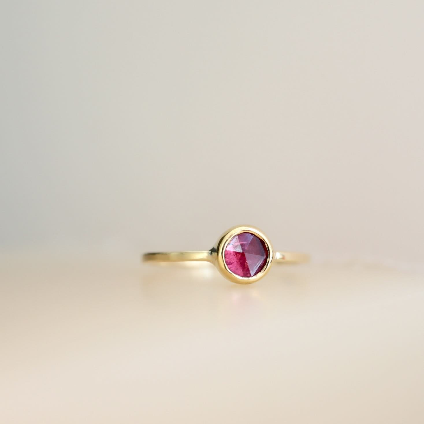 Een felroze toermalijn, rosecut in een 22 karaat gouden zetkastje tussen de ring gezet. Een fantastische tint! De ring is gemaakt van 14 karaat goud.