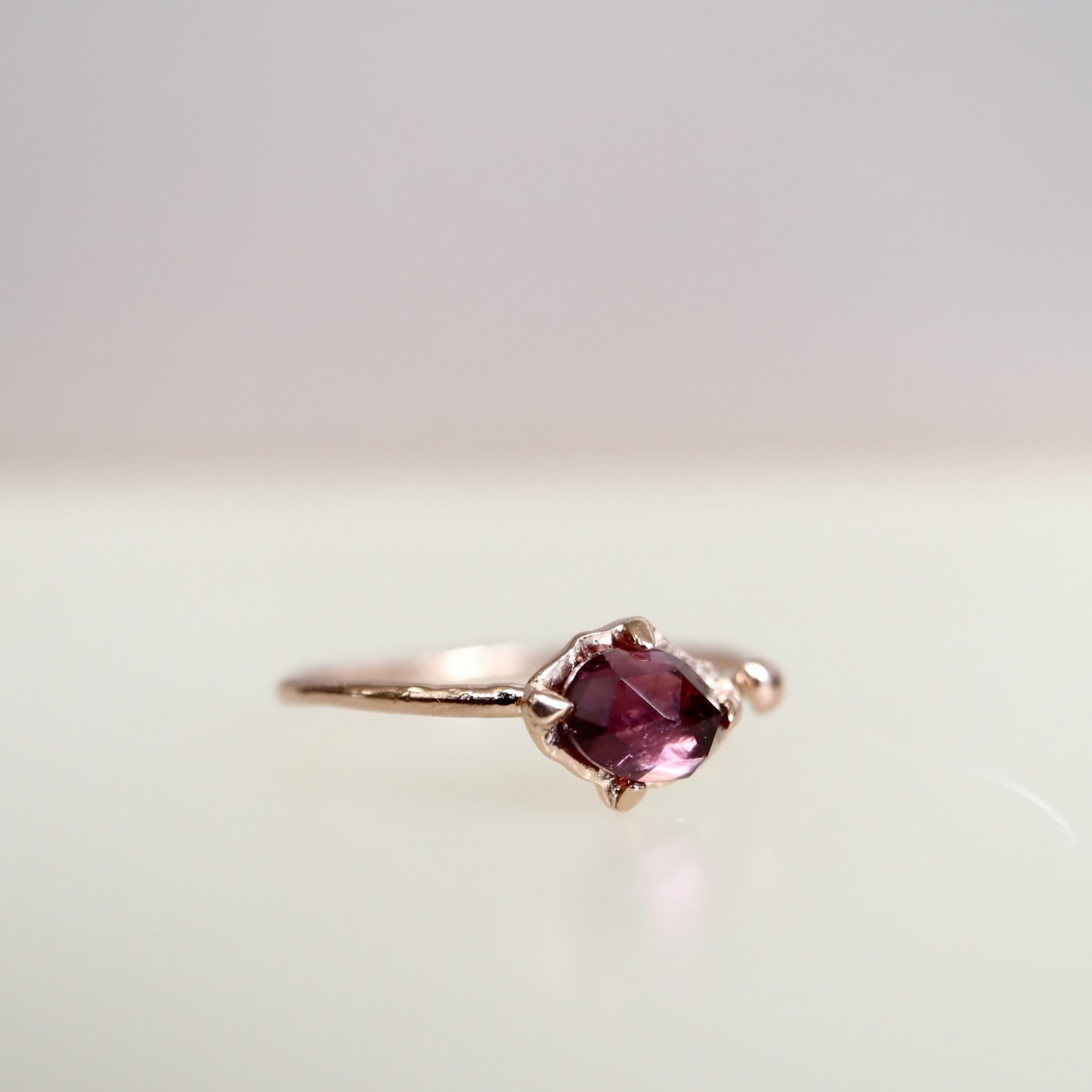 Een rosecut toermalijn met een betoverend kleurenspectrum. Een siroop roze, maar ook een aubergine en blauwe tint. De toermalijn is gezet in een haast rauwe zetting met een gouden bolletje naast de steen. De ring is gemaakt van 14 karaat roodgoud.