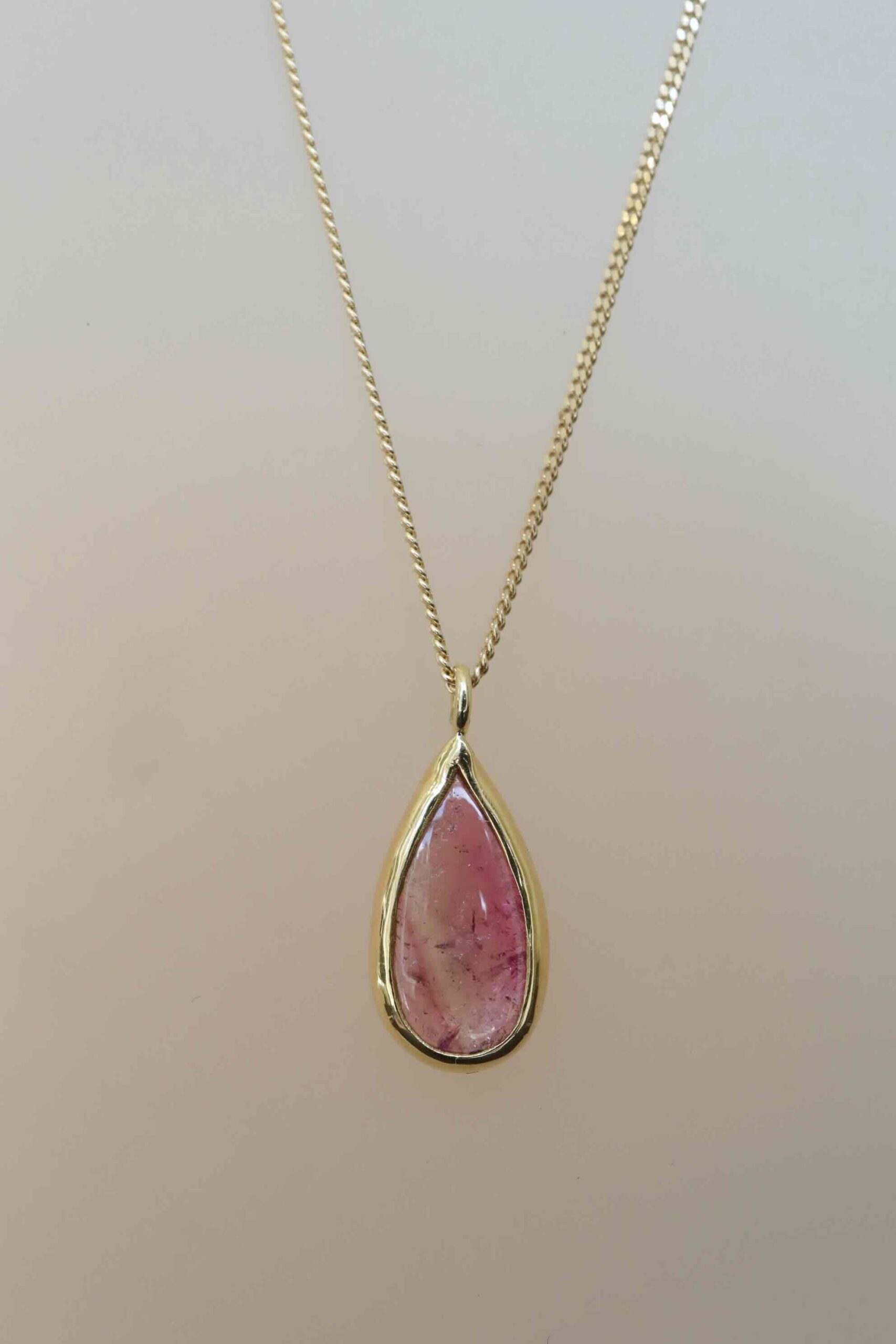 Een collier van 18 karaat gouden gourmette schakels en een juweel van een toermalijn! De druppel is roze met zachtroze en champagne tinten. De zetting is gemaakt van 22 karaat goud.