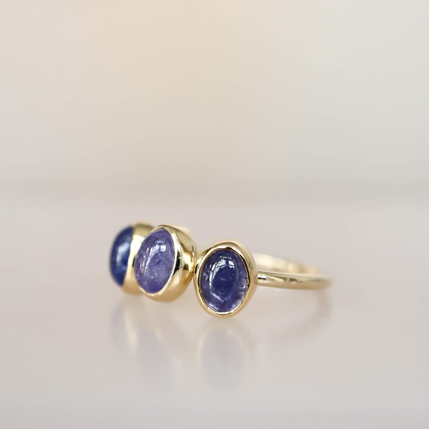 Korenblauwe tanzaniet met z’n drieën op de ring. Prachtig vol van volume. De ring is gemaakt van 22 en 18 karaat goud.