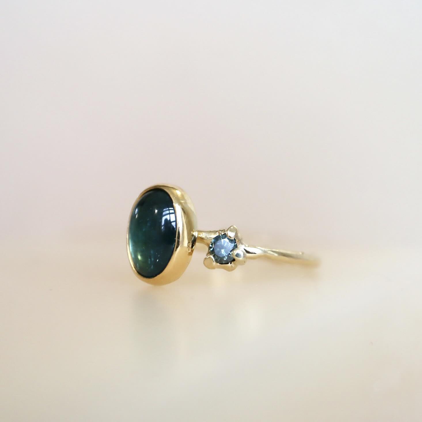 Een beeldschone groene toermalijn en een flonkerende blauwe diamant. De zetkastjes zijn lekker contrasterend, wat gek genoeg een mooie balans oplevert. De ring is gemaakt van 22 en 18 karaat goud. De diamant is 0.16 ct.