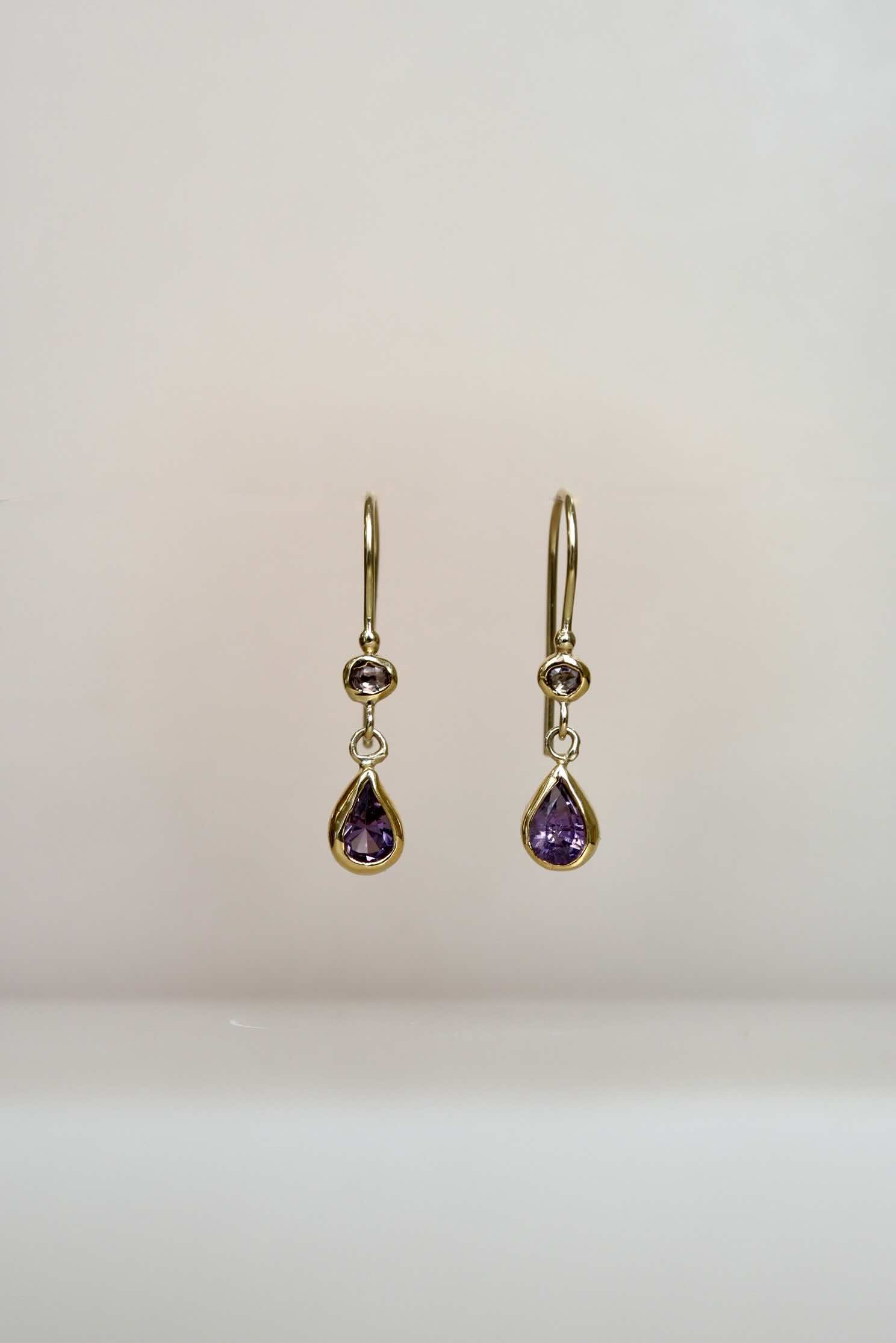 Bungelende, paarse spinel druppels en rosecut diamantjes daarboven. Beautiful! De oorbellen zijn gemaakt van 22 en18 karaat goud. De diamanten zijn samen 0.17 ct.