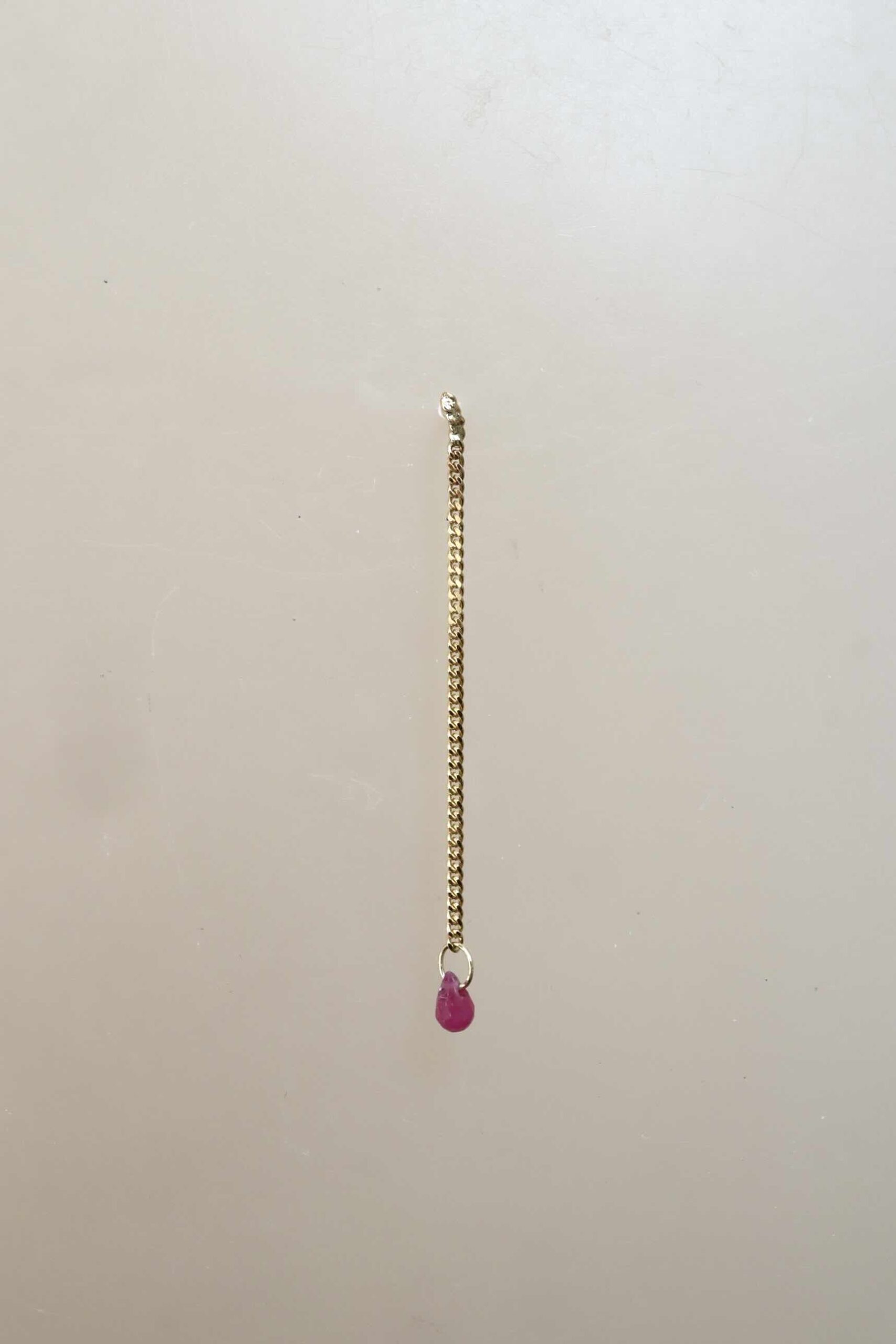 Een sprankelend mooi roze druppel saffiertje onderaan een sliertje gourmette schakels. Super sweet! Deze enkele oorbel is gemaakt van 18 karaat goud.