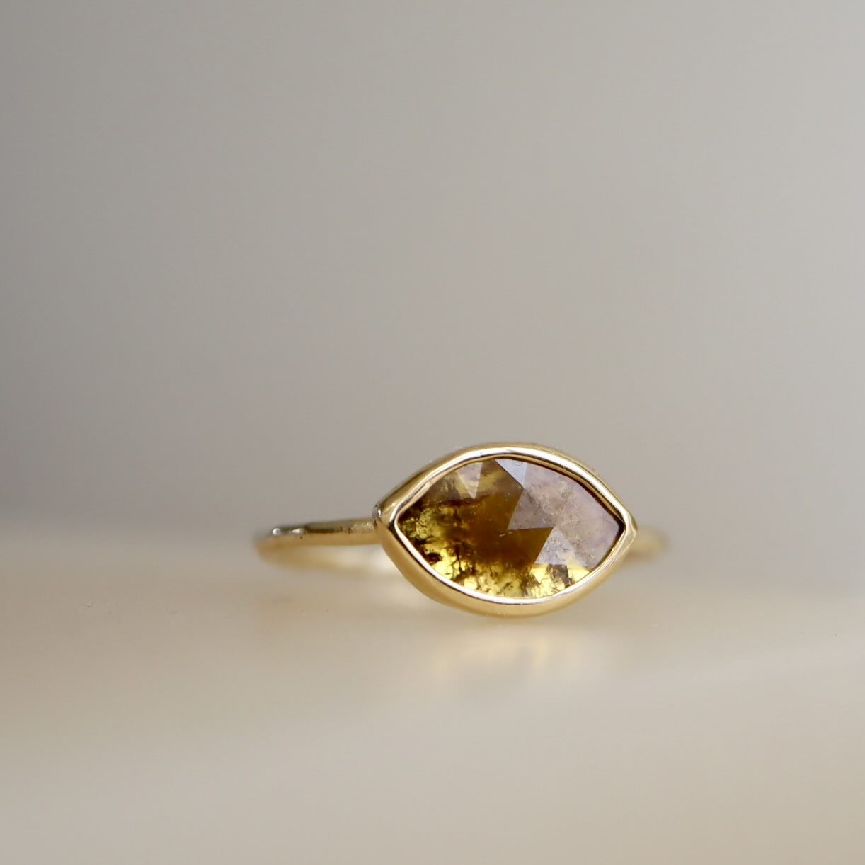 Een fantastische diamant slice in een geel groenige kleur met krachtige facet flonkeringen. De diamant is 0.825 ct. Het zetkastje is gemaakt van 22 karaat goud. De ring is gemaakt van 14 karaat goud.