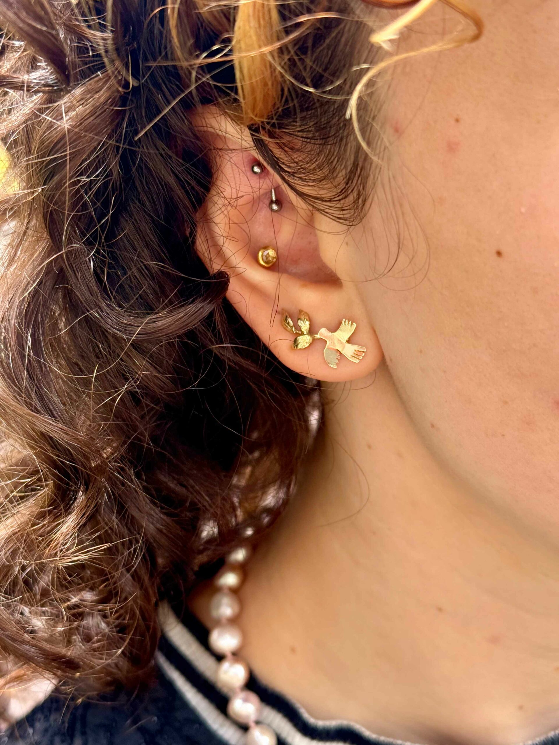 Een allerliefst klein vredesduifje voor in je oor. Een enkele oorsteker van 14 karaat goud.