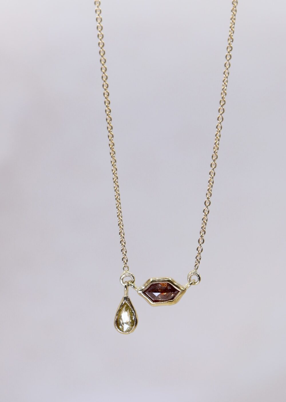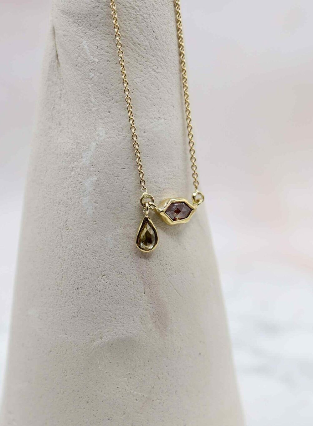 Een prachtig, elegant collier met een warm bruine, zeskant diamant van 0.58 ct. tussen het collier. Met daarnaast een bungelende, druppel diamant van 0.17 ct. Het collier is gemaakt van 18 karaat gouden ankerschakels. De zetkastjes zijn van 22 karaat goud gemaakt.