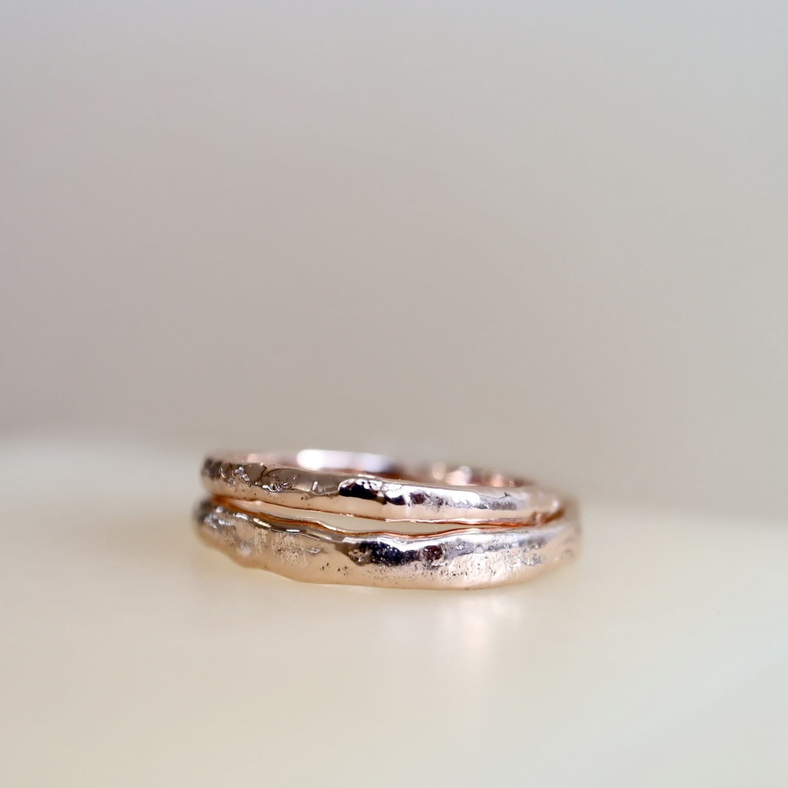Twee prachtige ringen, ontstaan uit een vloeiende beweging van het goud. Elke ring die op deze manier gemaakt wordt, heeft zijn eigen, unieke vorm. De ringen zijn gemaakt van 14 karaat roodgoud.